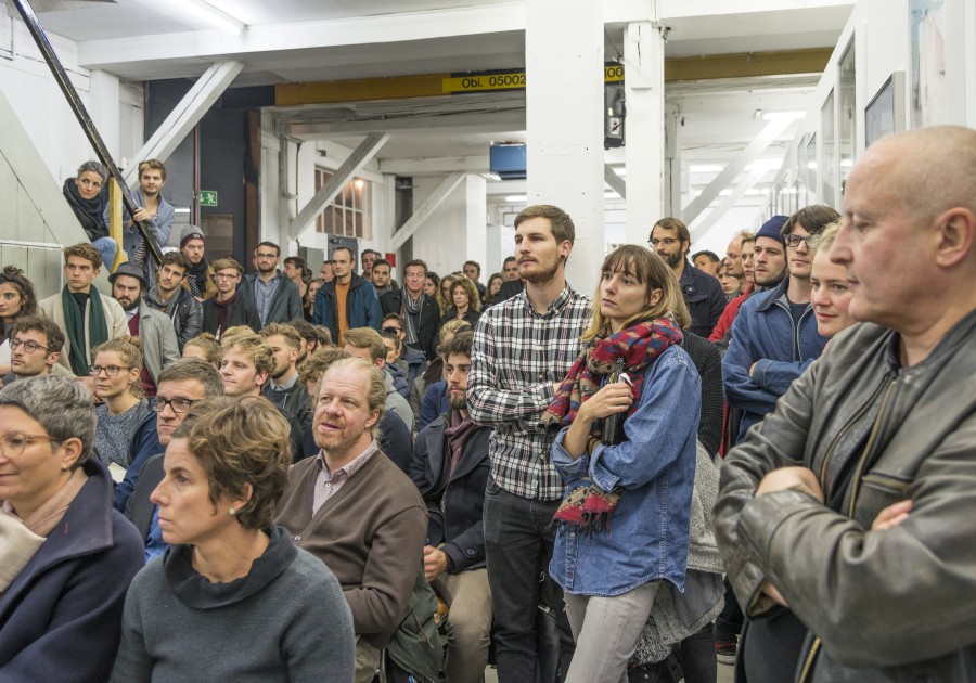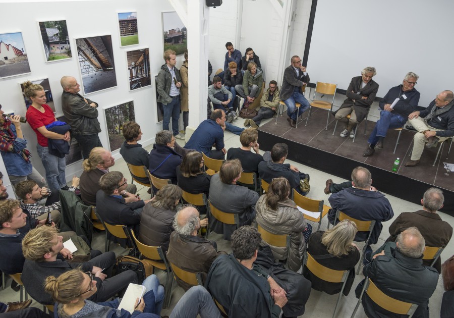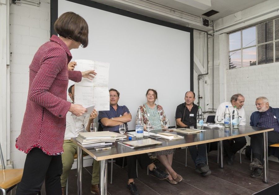Podium «Italomodern — Generationengespräch zur Italienforschung»: Astrid Staufer im Gespräch mit Bruno Reichlin, Marcel Meili, Markus Peter, Ingrid Burgdorf, Matthias Bräm und Giulio Bettini (v.l.n.r.)
